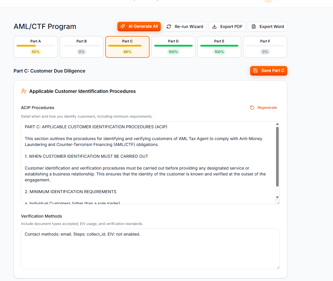AUSTRAC requires every reporting entity to have a written program covering six parts (A through F). Most people stare at the 200-page AUSTRAC guidance and freeze. So let's open the editor and show you exactly what you're working with.