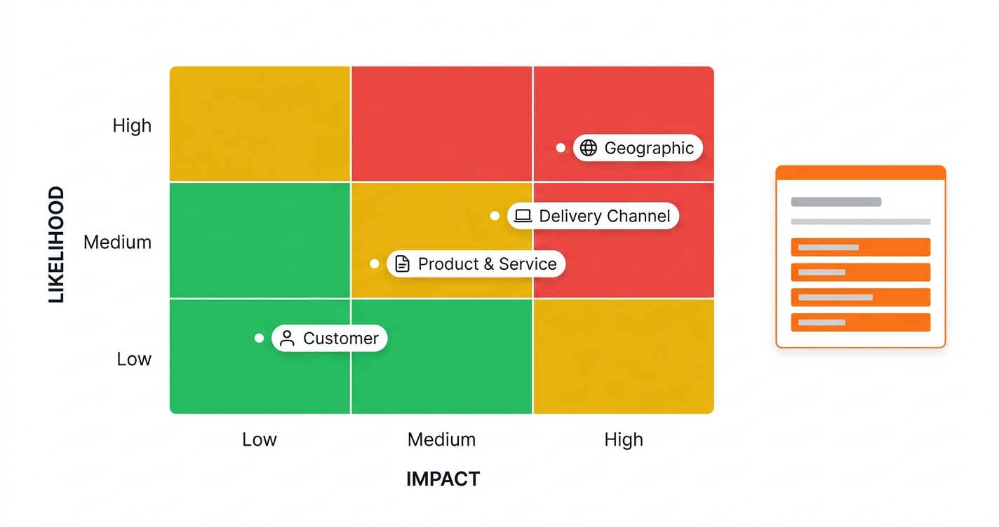 Apply this score to each of the four factors. Your overall ML/TF risk is the highest of the four (not the average — one high-risk factor drives your whole program to "high").