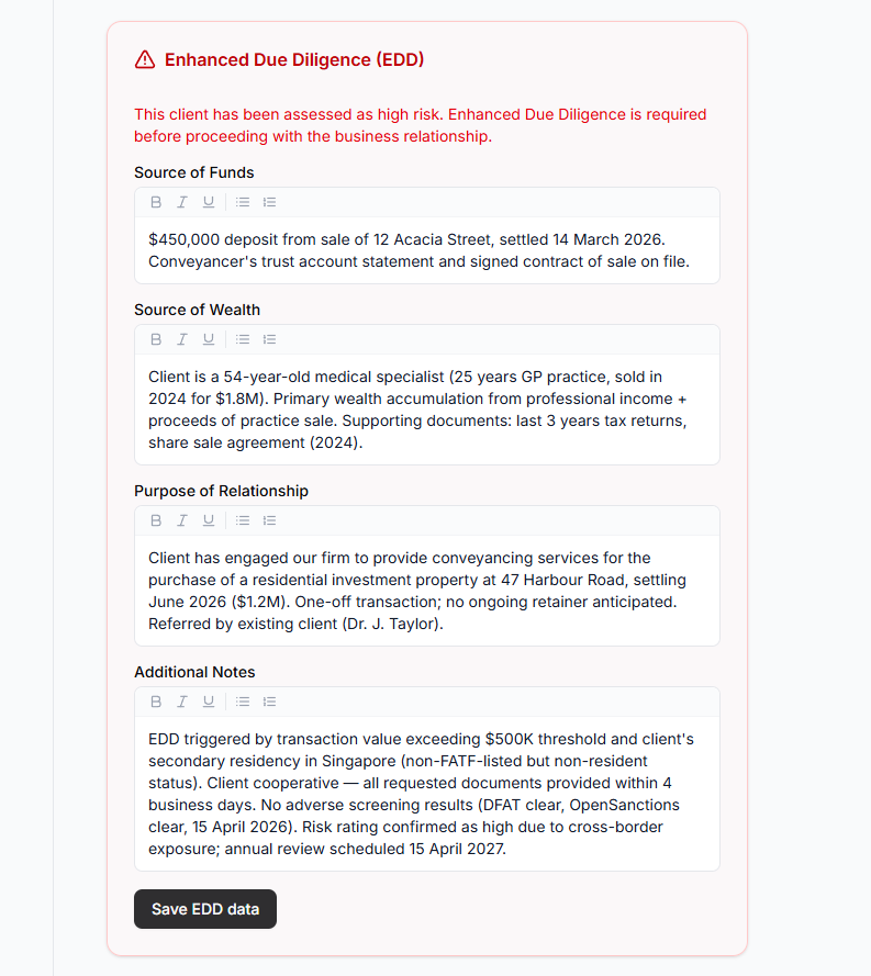 EDD is one of the highest-friction moments in client onboarding. AML Mate's client record includes dedicated SOF and SOW fields, document upload slots with labelled categories (sale contract, tax return, probate, etc.), and AI-assisted drafting of the file note that reconciles your questions, their answers, and the documents collected — so your EDD record is audit-ready the day you close it, not six months later when someone asks.